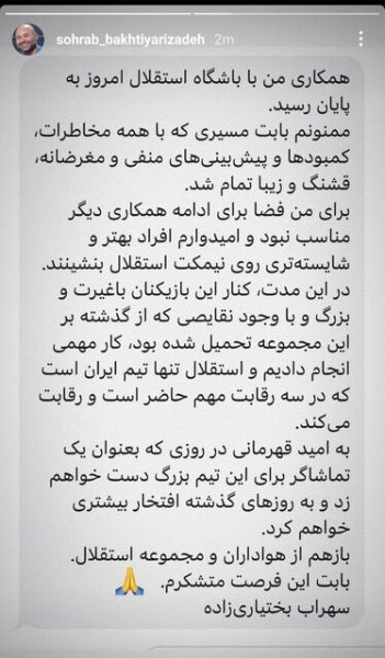 تیم فوتبال استقلال با هدایت سهراب بختیاریزاده به عنوان سرمربی موقت، با برتری مقابل الریان به دور حذفی لیگ نخبگان راه یافت. با این حال، بختیازیزاده امروز با انتشار پستی در فضای مجازی اعلام کرد که از سرمربیگری استقلال استعفا کرده است.